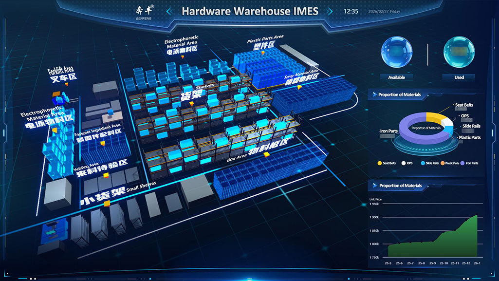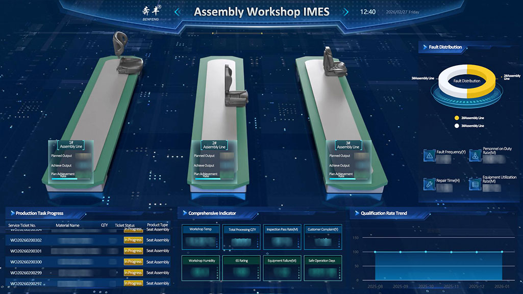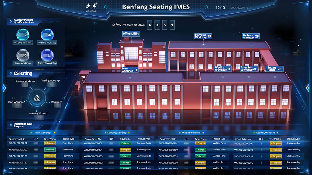 বেনফেং সিটস IMES-এর ডিজিটাল ইকোসিস্টেমে, অ্যাসেম্বলি ওয়ার্কশপ, তার বুদ্ধিমান পূর্ণ-প্রক্রিয়া ব্যবস্থাপনার সাথে, সমাপ্ত আসনের গুণমানের জন্য চূড়ান্ত পরীক্ষার ক্ষেত্র হয়ে ওঠে৷