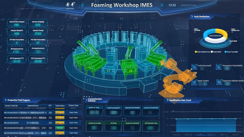 বেনফেং সিটস আইএমইএস (বেনফেং সিটস ইন্টেলিজেন্ট ম্যানুফ্যাকচারিং প্ল্যাটফর্ম) এর ডিজিটাল ম্যাট্রিক্সের মধ্যে, ফোমিং ওয়ার্কশপ, তার অত্যন্ত বুদ্ধিমান উত্পাদন পরিবেশ সহ, সিট আরাম পারফরম্যান্সের জন্য মূল ফোর্জিং গ্রাউন্ডে পরিণত হয়েছে৷