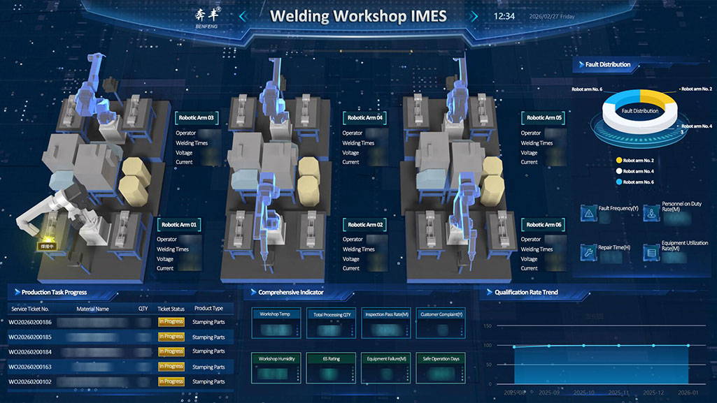 3D ভিজ্যুয়ালাইজেশন প্রযুক্তির মাধ্যমে, কর্মশালাটি স্পষ্টভাবে একাধিক বুদ্ধিমান ঢালাই রোবোটিক অস্ত্রের সহযোগিতামূলক অপারেশন উপস্থাপন করে। প্রতিটি রোবোটিক বাহু একটি নিবেদিত অপারেটর এবং প্যারামিটার মনিটরিং মডিউল (ভোল্টেজ, কারেন্ট, ওয়েল্ডিং গণনা ইত্যাদি) দিয়ে সজ্জিত, একটি সুনির্দিষ্ট এবং নিয়ন্ত্রণযোগ্য ঢালাই প্রক্রিয়া অর্জন করে। একই সাথে, এটি মূল সূচক যেমন তাপমাত্রা, আর্দ্রতা, এবং বাস্তব সময়ে প্রতিদিন ওয়েল্ডিং অপারেশনের সংখ্যা নিরীক্ষণ করে, পরিবেশ থেকে প্রক্রিয়া পর্যন্ত সমস্ত মাত্রা থেকে ঢালাইয়ের গুণমান নিশ্চিত করে৷